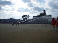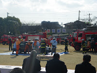 第3部では訓練展示などが行われ、自主防災組織の活動宣言、消防団による小型ポンプ操法、防災協会による消化器操法、屋外消火栓操法ののち、消防局の職員による総合訓練が行われ、予定通りに終了しました。